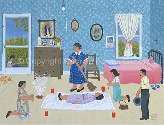 Barriendo de Susto, 1986, gouache on cotton paper, 14 x 18 inches. #PA010. This image is available for commission as an oil painting.